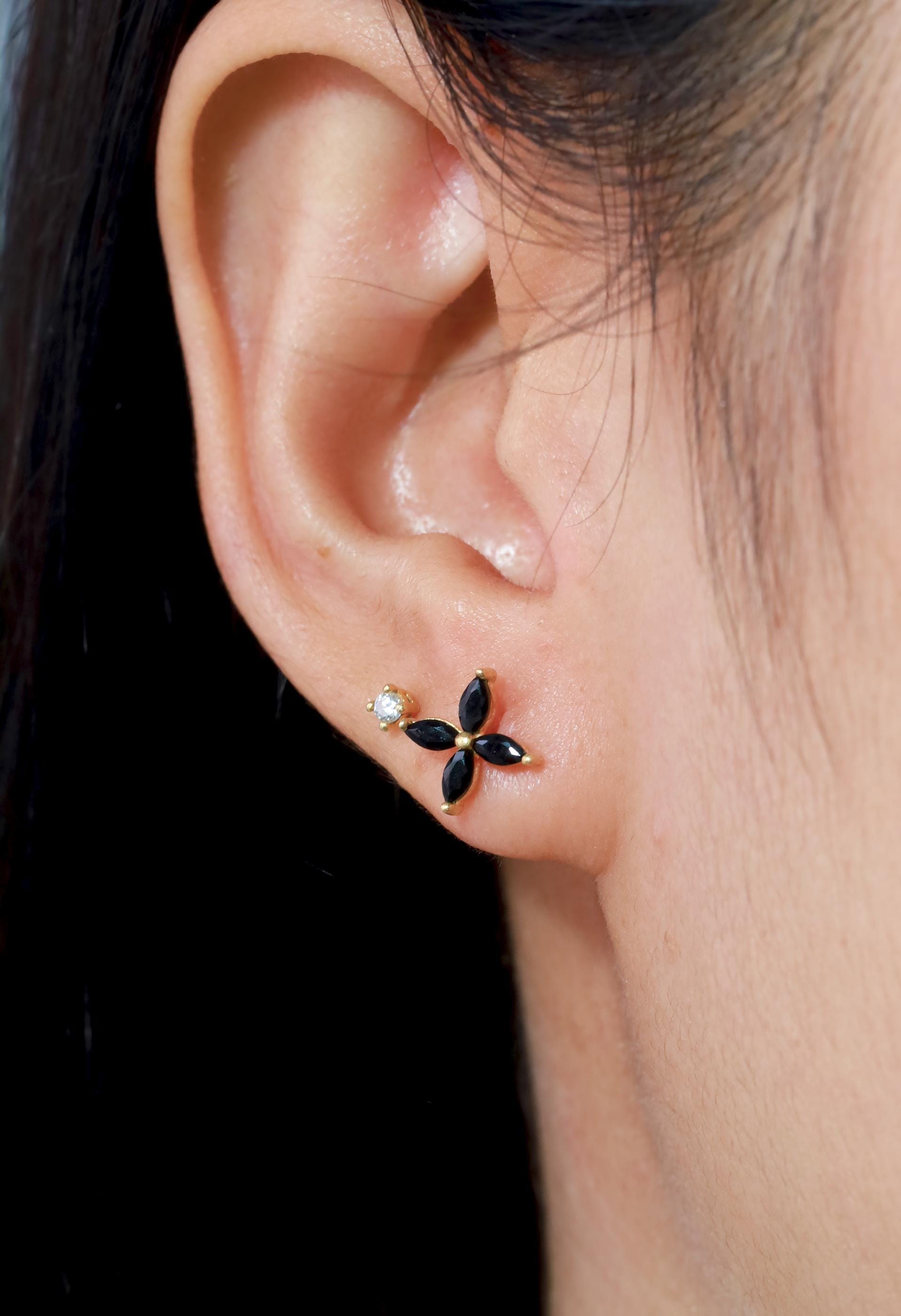 14K Gold Marquise Black Diamond Flower Stud Earrings